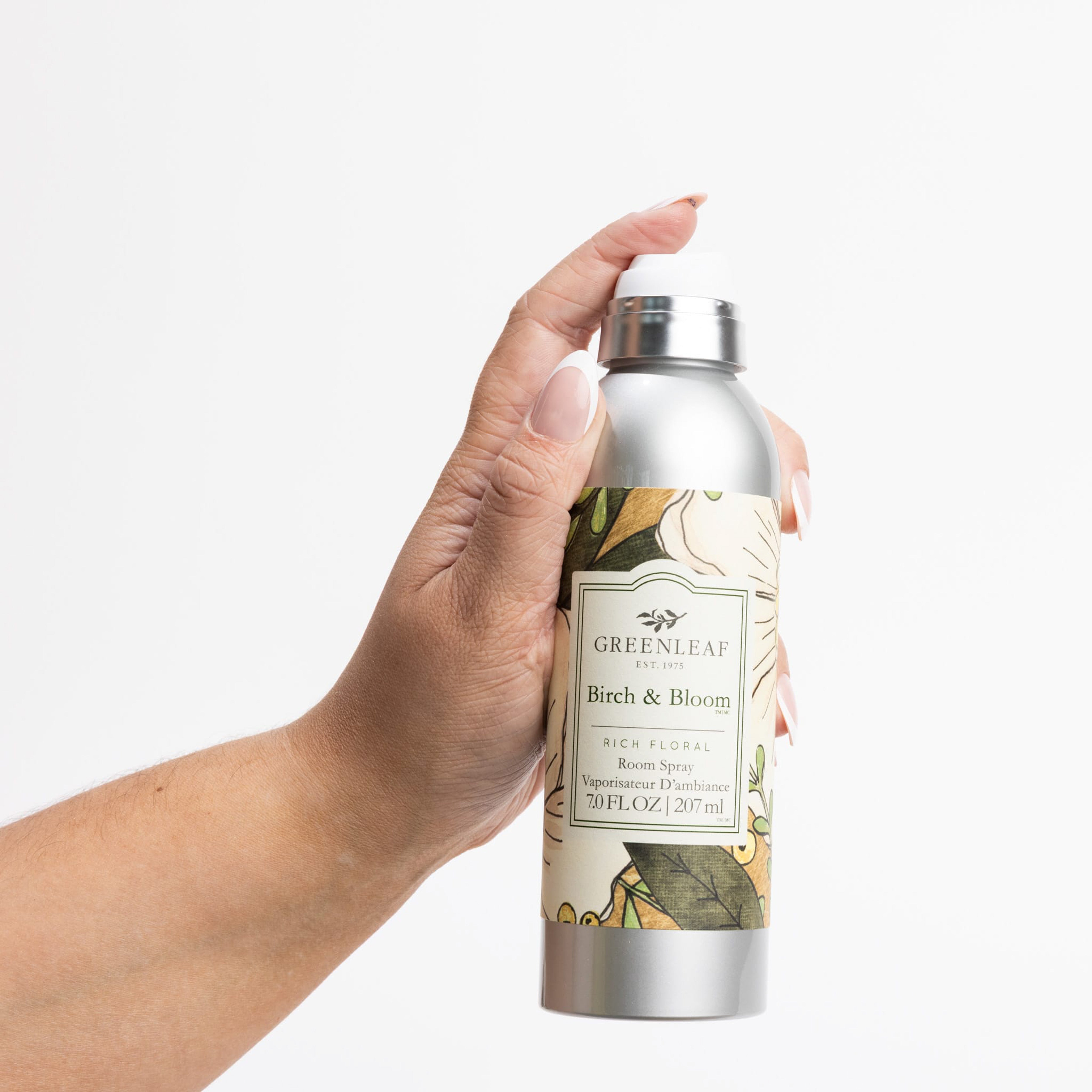 A silver can of Greenleaf Gifts Birch & Bloom Room Spray, 7.0 FL OZ / 207 ml, with a floral design and fragrance, is shown against a plain white background.