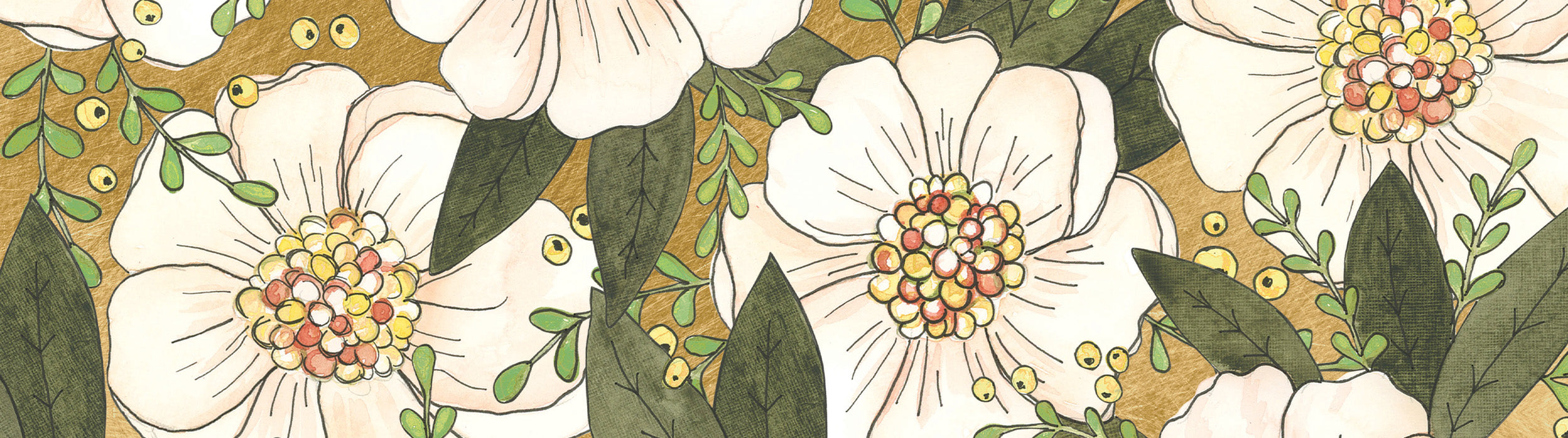 A hand-drawn floral pattern featuring large white flowers with yellow centers, green leaves, and small yellow berries on a light brown background.
