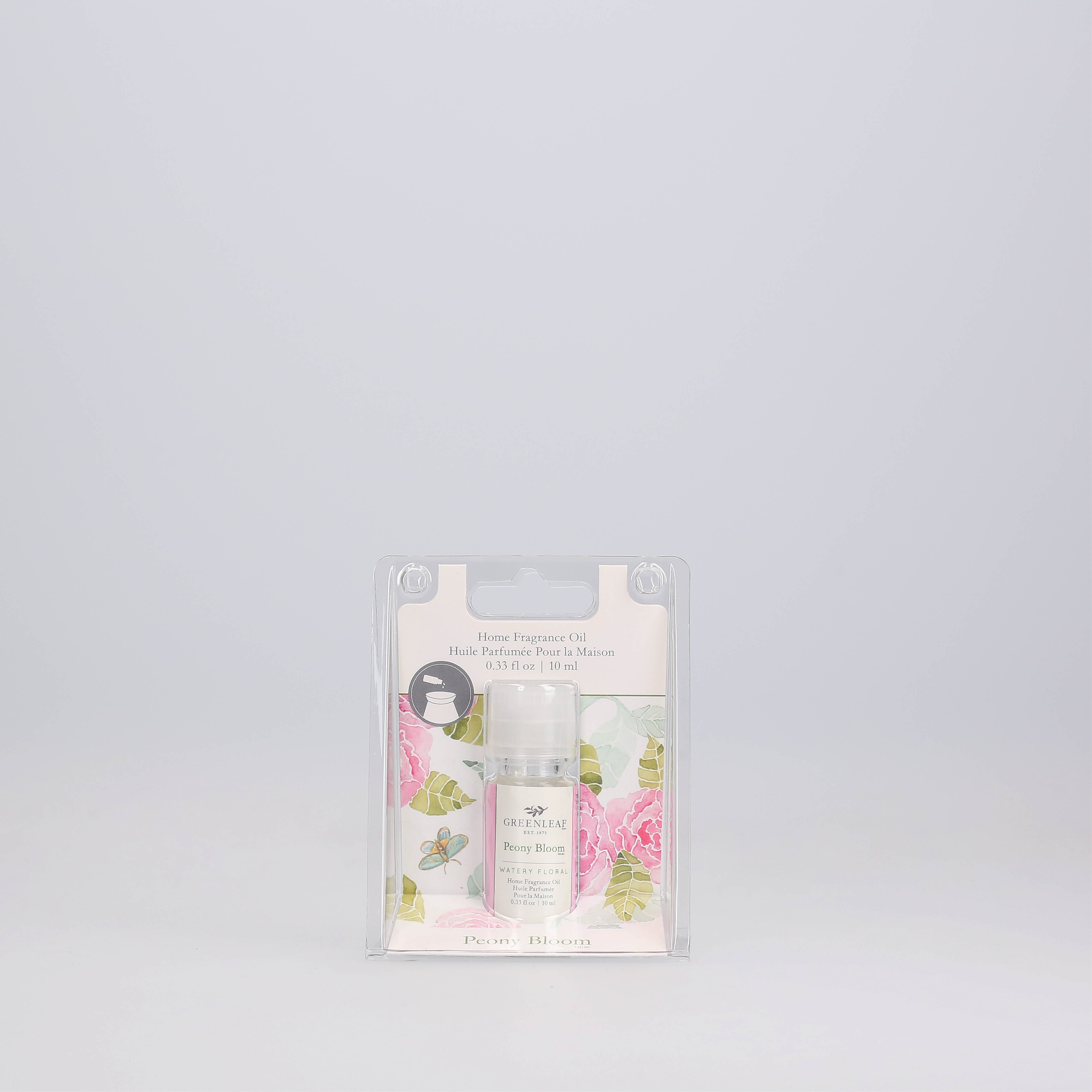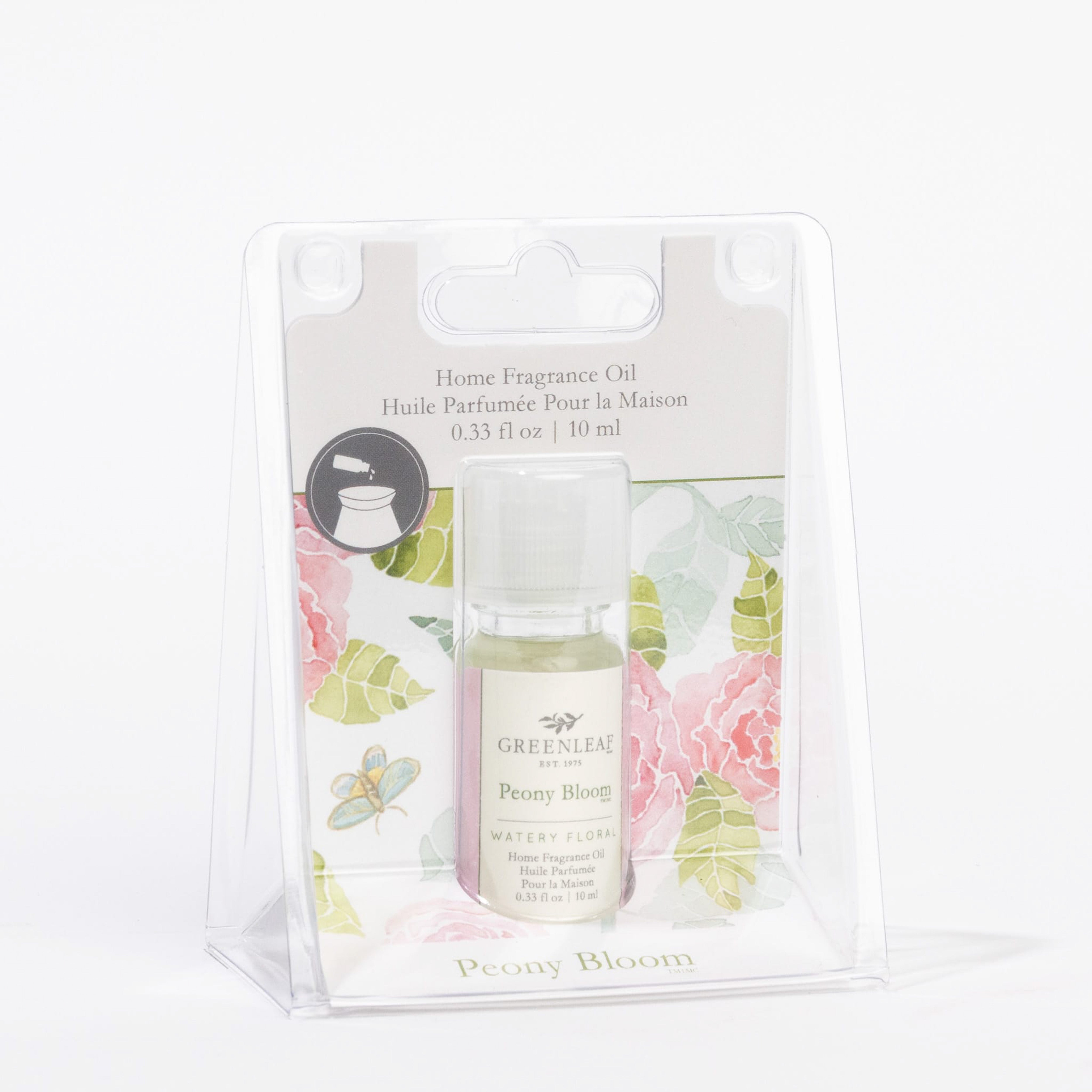 Greenleaf Gifts Peony Bloom Home Fragrance Oil comes in a 10 ml (0.33 fl oz) clear bottle with floral and butterfly artwork, providing a flameless scent experience labeled as Peony Bloom.